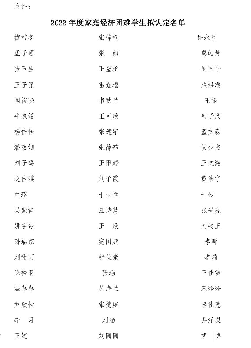 根据《关于评选2022年度国家奖学金、国家励志奖学金、国家助学金的通知》(江海大校办[2022]63 号)和《江苏海洋大学国家助学金实施办法(修订)》(江海大[2021]129号)等文件要求等文件有关规定,经学生申请,班主任同意,学院评审小组评议,认定244名学生为家庭经济困难学生并建立困难生档案,现面向全院进行公示。公示期5天。如有异议,请于公示期间以书面形式向学院反映。