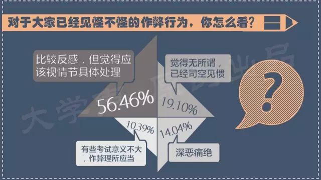 对于考试作弊深恶痛绝的同学只占总数的14%,这个比例可能和社会上的一般印象,以及高校管理者的态度有出入。