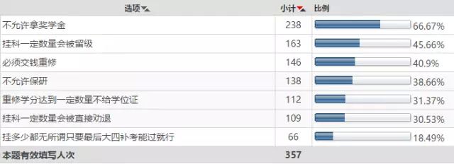 但像最后的占18%的不论挂多少门都无所谓,只要能大四补考过就可以的学校,就很可能会培养学生对挂科不在乎,虱子多了不咬人挂多了不愁人的心态,反而会使他们挂更多的课。
