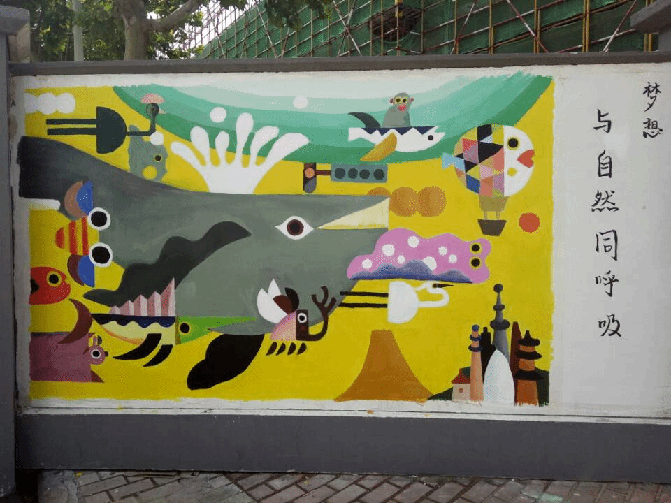 21日周一,下午5时,下课的人群熙熙攘攘,第四教学区工地围墙边,艺术学院的大一学生李润璇和许祖妍手拿着事先分配好的图片,调色,勾线,上色,在她们的画笔下,一条鲸的形象逐渐鲜活起来,手拿着调色板的李润璇说道:“颜料是由丙烯制成,墙绘可以长时间保存。”
