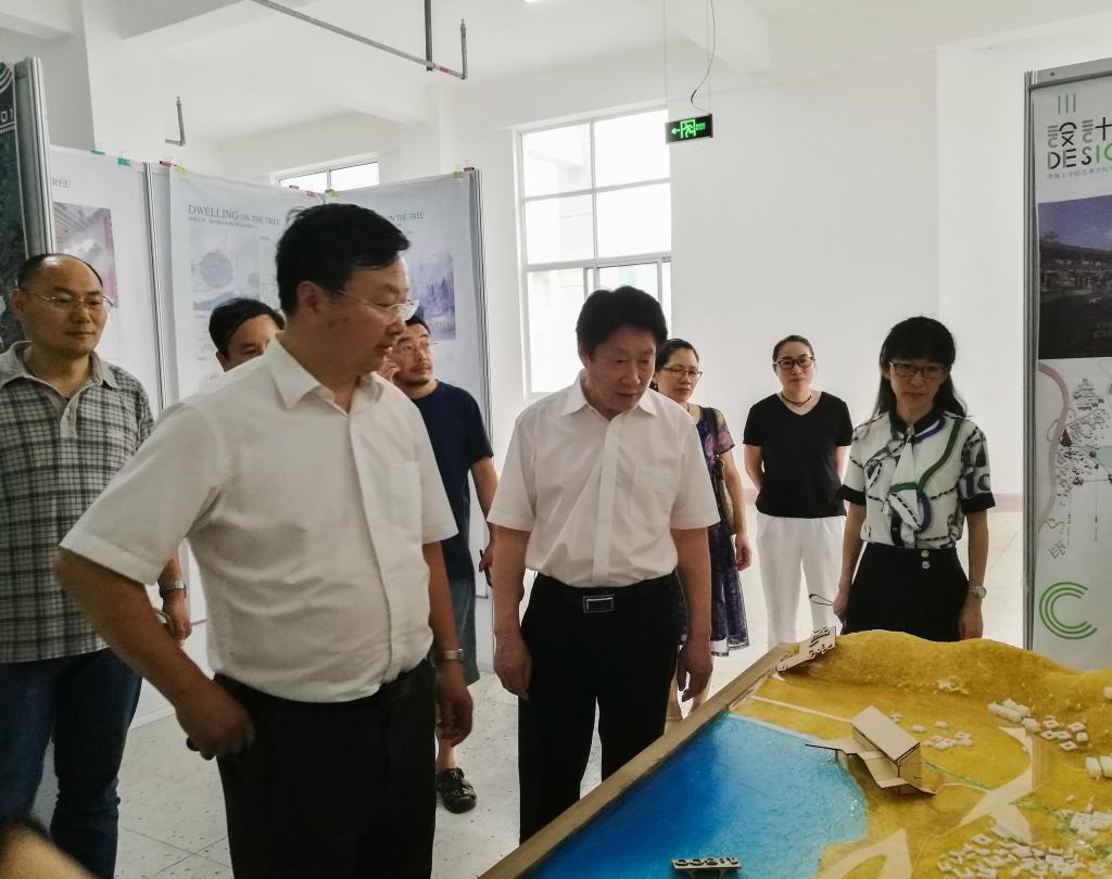 7月4日下午,校党委书记赵炳起、校长宁晓明、副校长金芙蓉来到筑海楼二楼展厅,在艺术学院党政领导的陪同下,参观了艺术学院2018届毕业设计作品展。校领导对艺术学院毕业设计作品给予了高度评价。