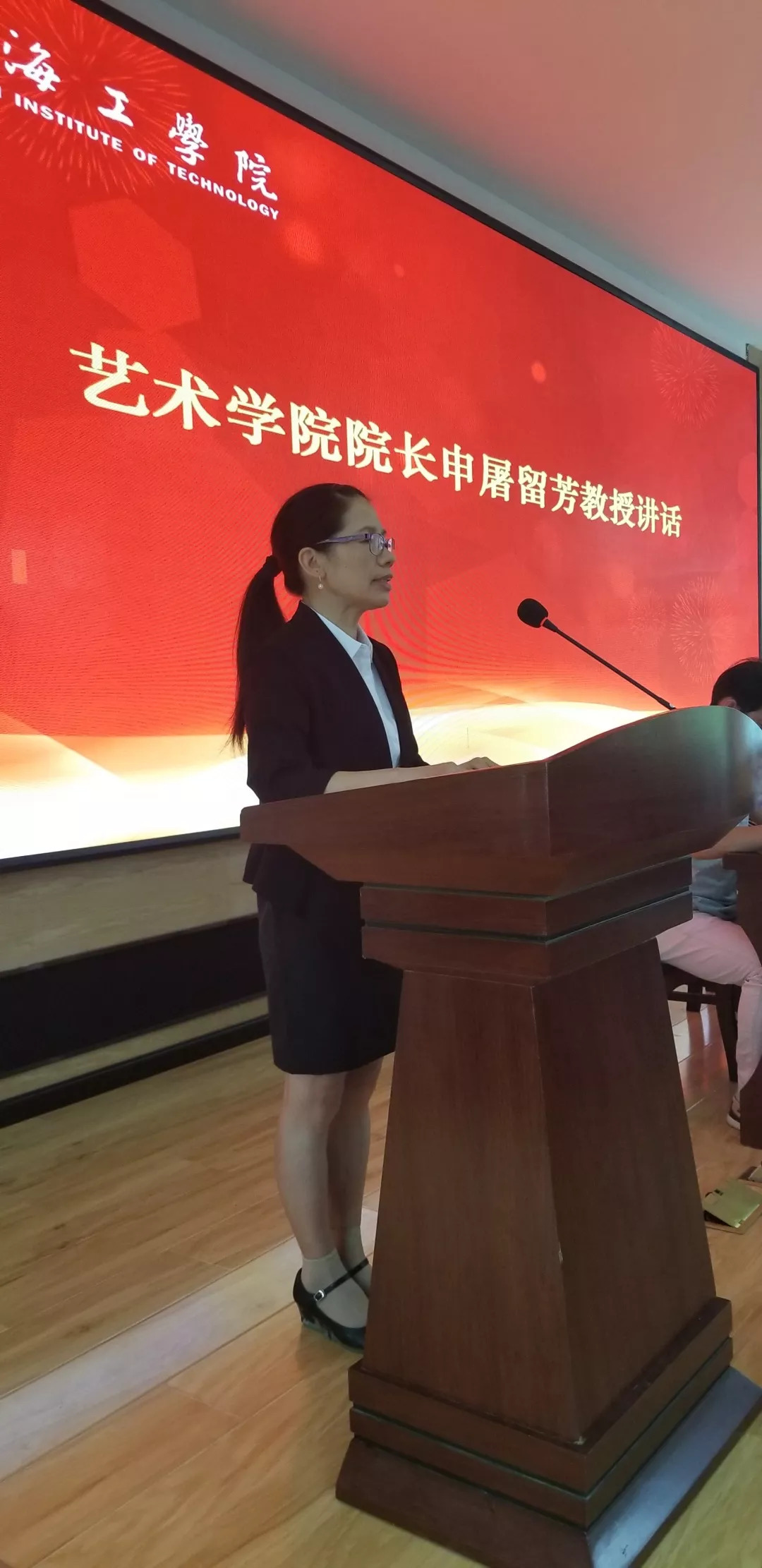艺术学院院长申屠留芳教授讲话。申屠院长对来自祖国四面八方的2018级新生们表示热烈的欢迎,向新生们介绍了艺术学院发展的基本情况。她还对新生提出了要求,即希望同学们在大学四年的生活里,珍惜学习的机缘,牢记青年担当,争取通过努力学习,做德、智、体、美全面发展的艺术事业接班人。