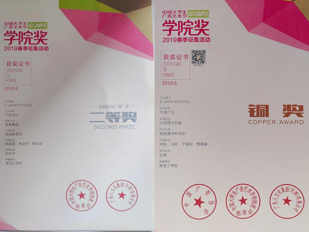 本次大赛共吸引全国1240所高校的150余万学子参加,参赛作品多达22万余件。经过激烈的角逐,我院刘欣、刘西羽、高亦婷的作品《年轻,我有我young!》荣获盼盼平面类银奖,吴国源、林志宇、杨宏运的作品《悦动的音符》荣获圣象集团产品设计银奖和企业金象奖二等奖,柯雅兰的作品《一命呜“呼” 自寻短“毽” “绳”之于法》荣获碧生源平面类银奖,杨洁、朱瑞卿、胡嘉琦的作品《青春隐身术》荣获恒安七度空间平面类银奖,刘欣、丁皓轩 、郭婧媛的作品《我就是你的太阳》荣获太阳雨太阳能平面类铜奖。
