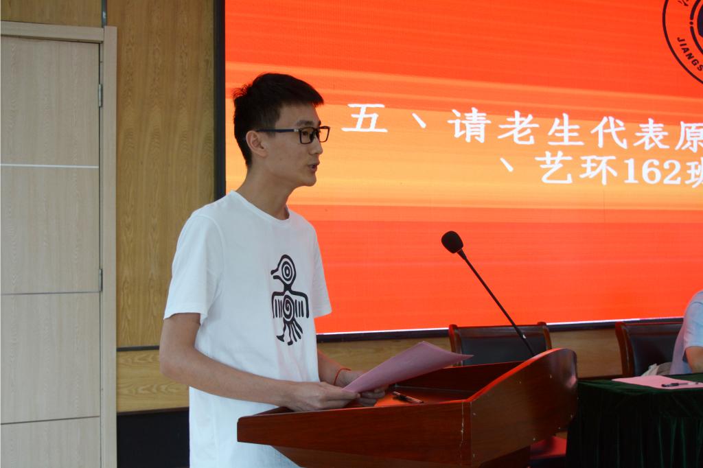 老生代表、原艺术学院学生团委书记、艺环162班团支书杨志勋同学发言,他建议大家养成良好的学习和生活习惯,做好大学生生涯规划。