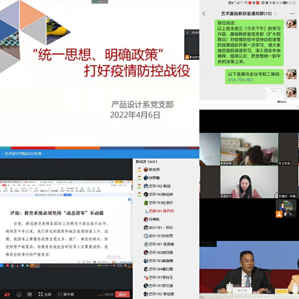 近期,全国本土聚集性疫情呈现点多、面广、频发的特点,连云港市外防输入的压力持续加大,学校是人员聚集场所,疫情防控形势同样严峻复杂。为充分发挥党组织在疫情防控工作中的战斗堡垒作用,进一步扎实做好疫情防控工作,统一思想,提高认识,在学院党总支的统一部署下,艺术设计学院党总支以党支部为支点, 4月6日下午开展了“坚定抗疫信念,筑牢防疫最强堡垒”主题党日在线学习活动。