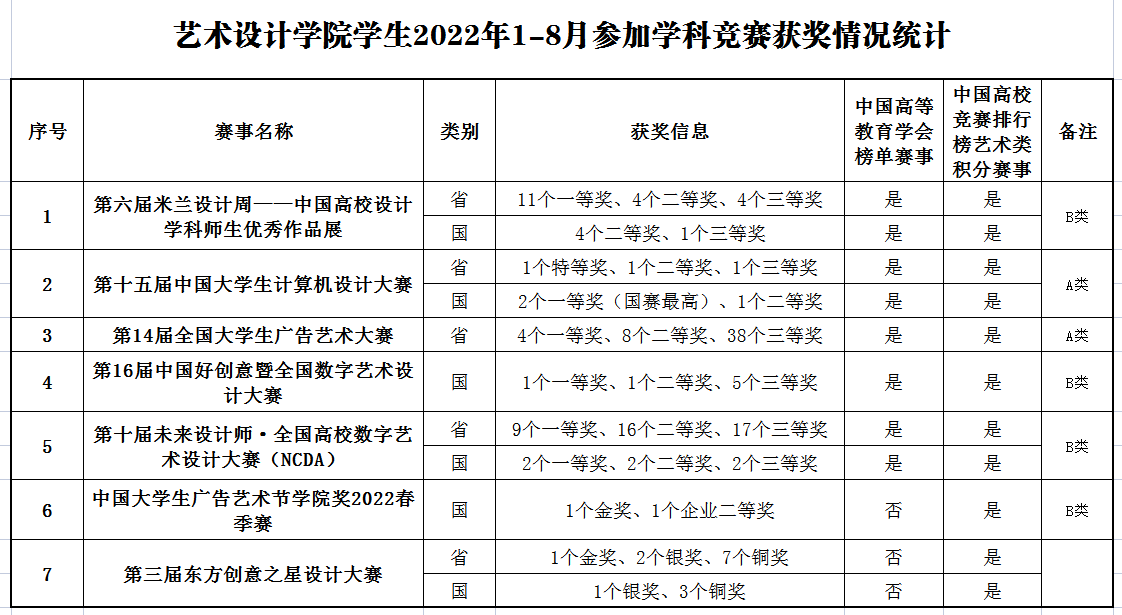 艺术设计学院坚持把培养卓越设计专业应用型人才作为目标,积极探索“以赛促教、以赛促学、学赛结合”教学模式,逐步走出了具有自身特色的人才培养之路。2022年上半年,学院以工作室为依托,结合专业课程实践,精心指导学生参加了全国大学生广告艺术大赛等近10项赛事。在2022年第六届米兰设计周——中国高校设计学科师生优秀作品展中,获得国赛二等奖4个、三等奖1个。在第十五届中国大学生计算机设计大赛中,获得国赛一等奖2个、二等奖1个。在第16届中国好创意暨全国数字艺术设计大赛中,获得国赛一等奖1个、二等奖2个、三等奖5个。在第十届未来设计师·全国高校数字艺术设计大赛(NCDA)中,获得国赛一等奖2个、二等奖2个、三等奖2个。在第三届东方创意之星设计大赛中,获得国赛银奖1个、铜奖3个。在中国大学生广告艺术节学院奖2022春季赛中,获得金奖1个、企业二等奖1个。