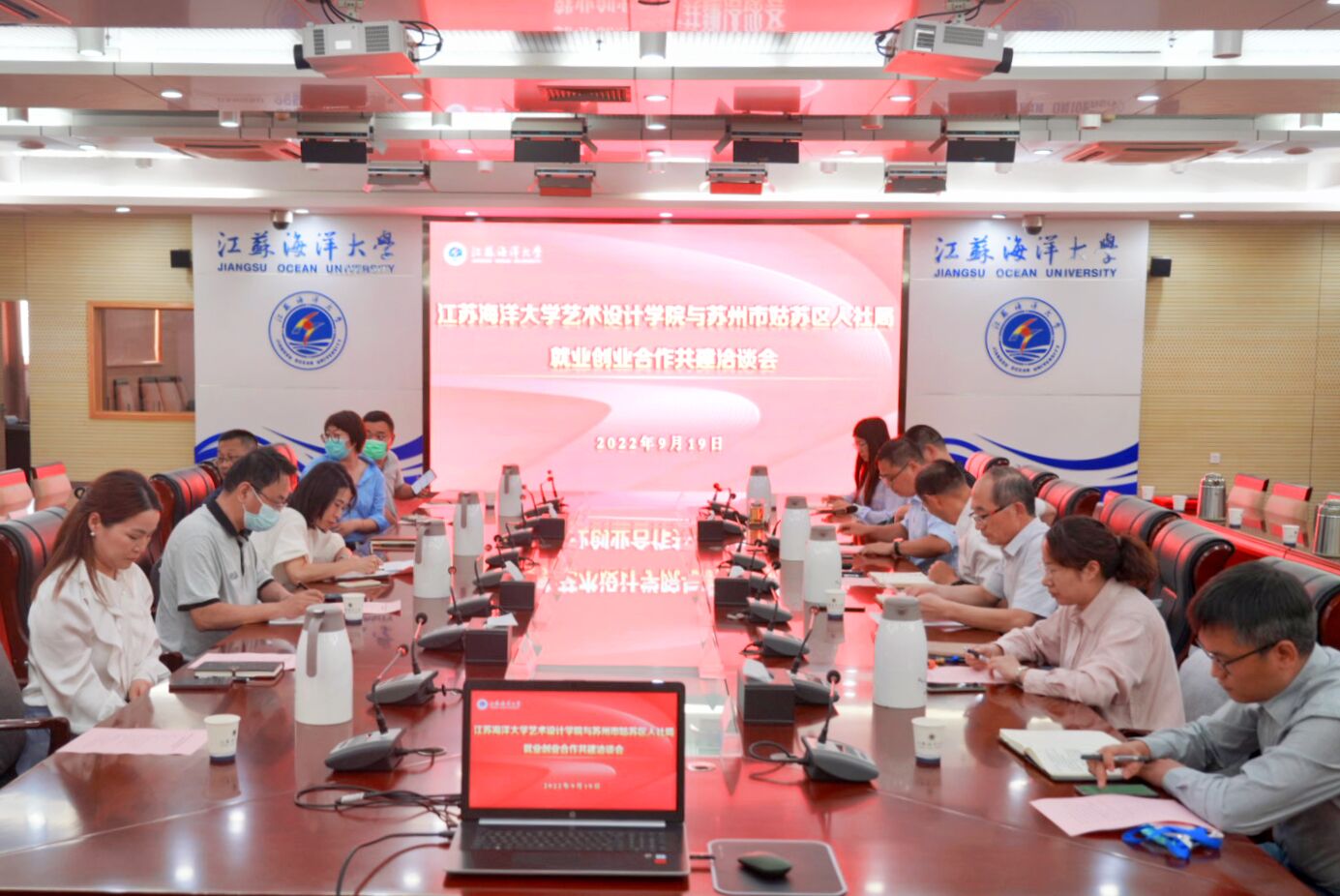为了进一步拓宽学院毕业生就业渠道,更好的开展产学研合作,服务地方经济发展与乡村振兴,9月19日下午,我院与苏州市姑苏区人力资源和社会保障局、苏州市姑苏区沧浪街道,在学术会议中心东海厅开展了就业创业合作共建活动,姑苏区人社局副局长薛梅、姑苏区沧浪街道党委副书记孙远带领相关部门工作人员及4家企业负责人等一行9人出席共建活动,省委驻赣榆区乡村振兴工作队队员杨殿闯(我校教师)、陈雨峰(沧浪街道)一同出席,校招生与就业处处长马恒通、我院领导班子成员及教师代表出席共建活动。