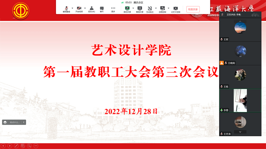 党总支书记李春在总结讲话中指出,此次会议依法保障了广大教职工参与学院民主管理、民主决策、民主监督的权利,对于学院各项事业发展将起到重要推动作用。他希望全院教职工以本次会议召开为契机,坚持“开放、求新、精进、致用”的院训和“尚美、进取、和谐”的院风,奋力打造设计创作能力强、社会服务水平高、具有海洋特色的艺术设计学院,为培养更多创新应用型艺术设计人才而努力奋斗。