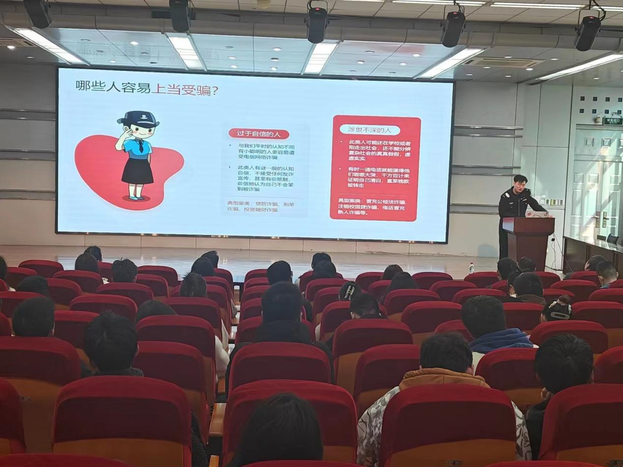 王欢在主题宣讲前进行了动员,他希望参加本次活动的同学认真学习防诈骗知识,增强自身防诈骗意识,同时要化身宣传员,带动身边的同学、亲朋共同防范电信诈骗,为学校、社会的和谐做贡献。