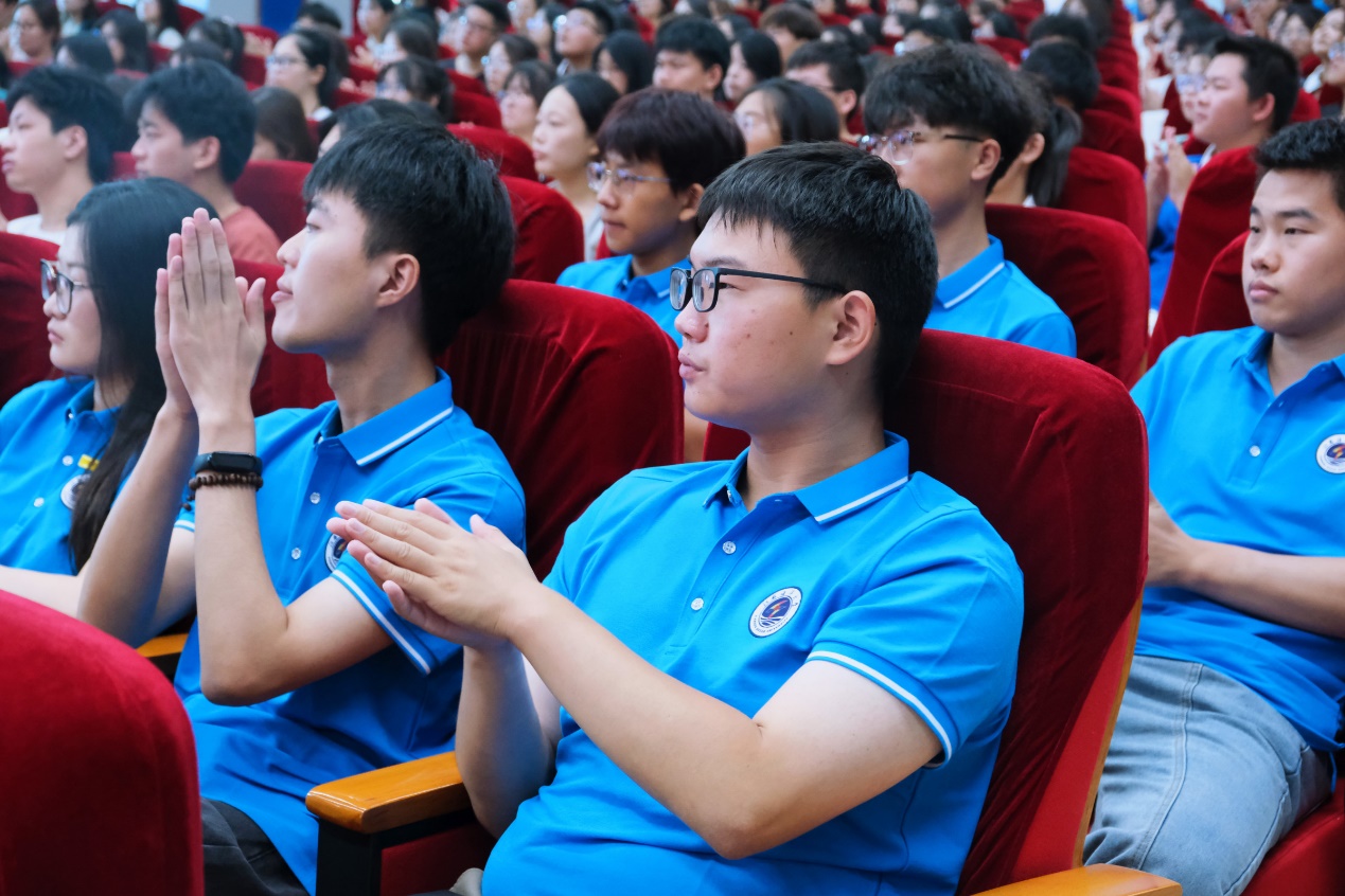 副院长曾英发表了热情洋溢的讲话,她首先对新同学表示热烈欢迎,祝贺他们进入江海大学习。曾英送给了新生三个词,分别是责任、守正、创新。第一是“责任”,她希望同学们能够担起责任,弘扬中华优秀文化,充满文化自信。第二是“守正”,她以《月亮与六便士》中的故事告诉同学们,要努力学习,完善人格,注重德行,不要成为像梁启超所说的三种人:像石头缝里的人,像沙漠的人,像蜡人一样了无生趣的人。第三是“创新”,她通过中华传统神话故事告诉大家,要不断追逐、勤能补拙,就算是在人工智能发展如此快速的时代下也要不忘初心、不断创新,弘扬与传承好中华优秀文化精神。