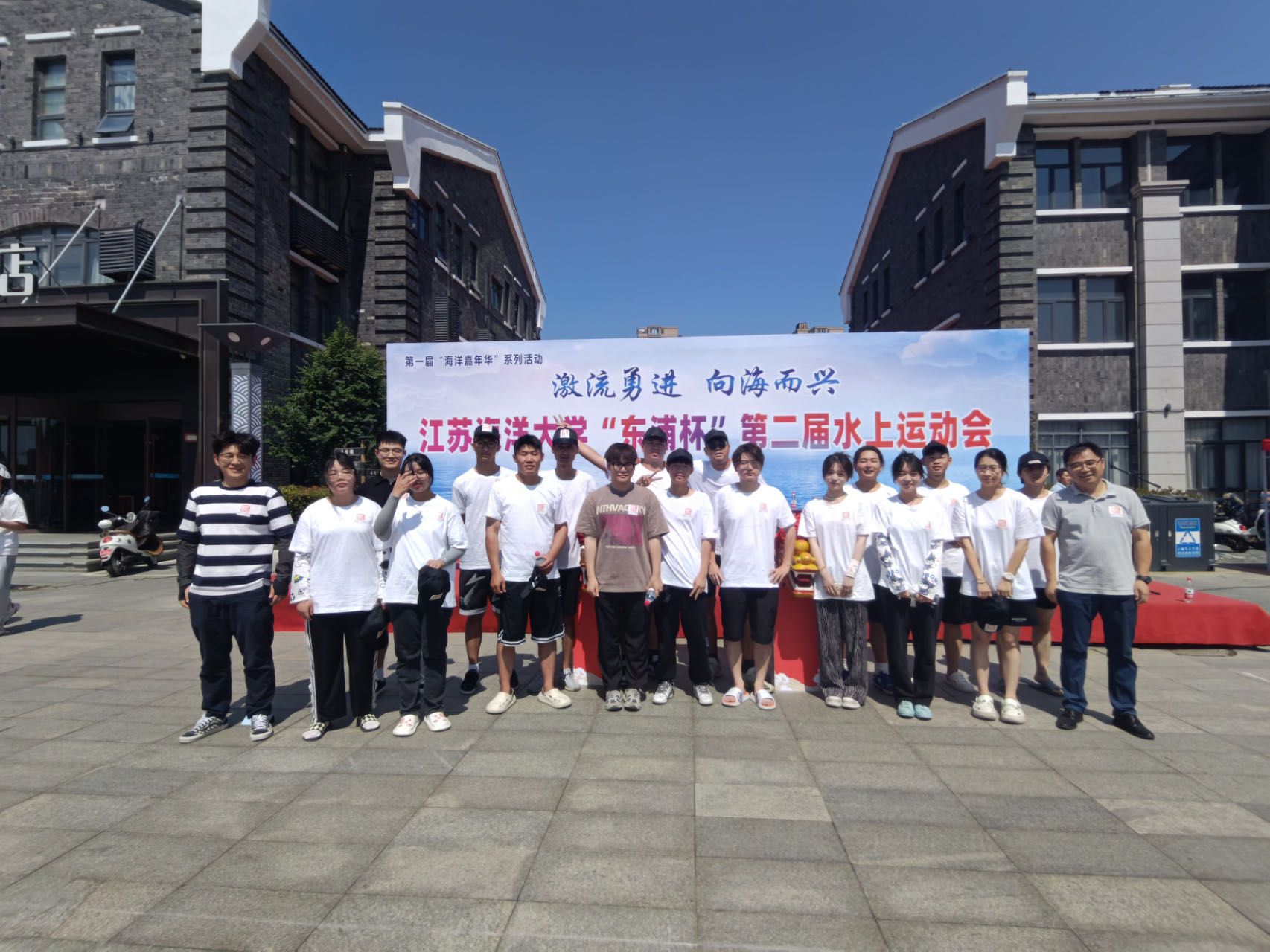 江苏海洋大学第二届水上运动会于2023年6月14日下午在东盐河举行。本届水上运动会共有龙舟、单人艇、双人艇三个项目,学生组和教工组两个组别共15支参赛队伍,近300名运动员参加比赛。