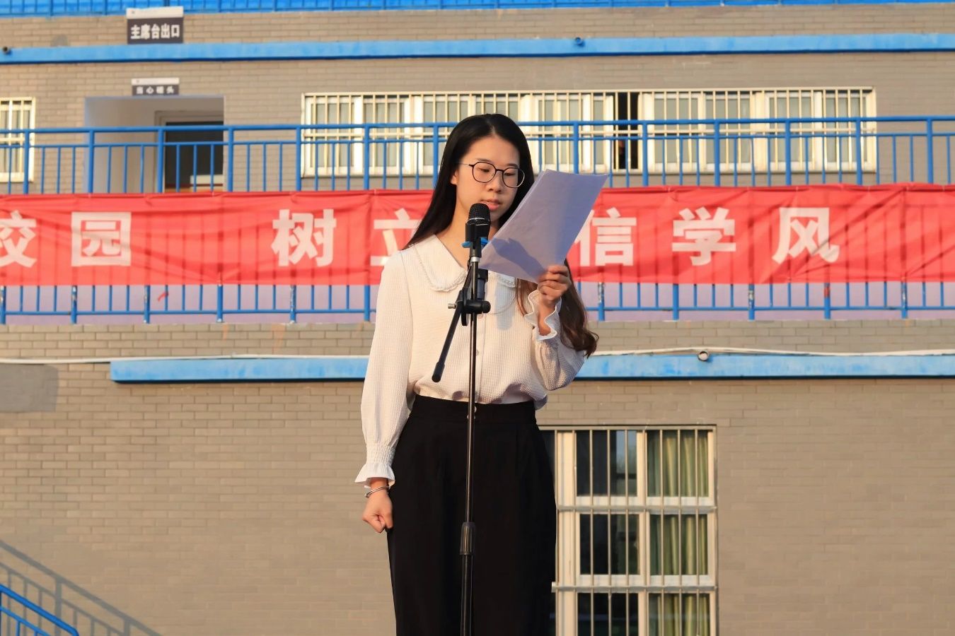 主席台上,“创建诚信校园 树立诚信学风 争做诚信学子”的标语格外醒目,五星红旗在全体师生齐唱国歌声中冉冉升起。