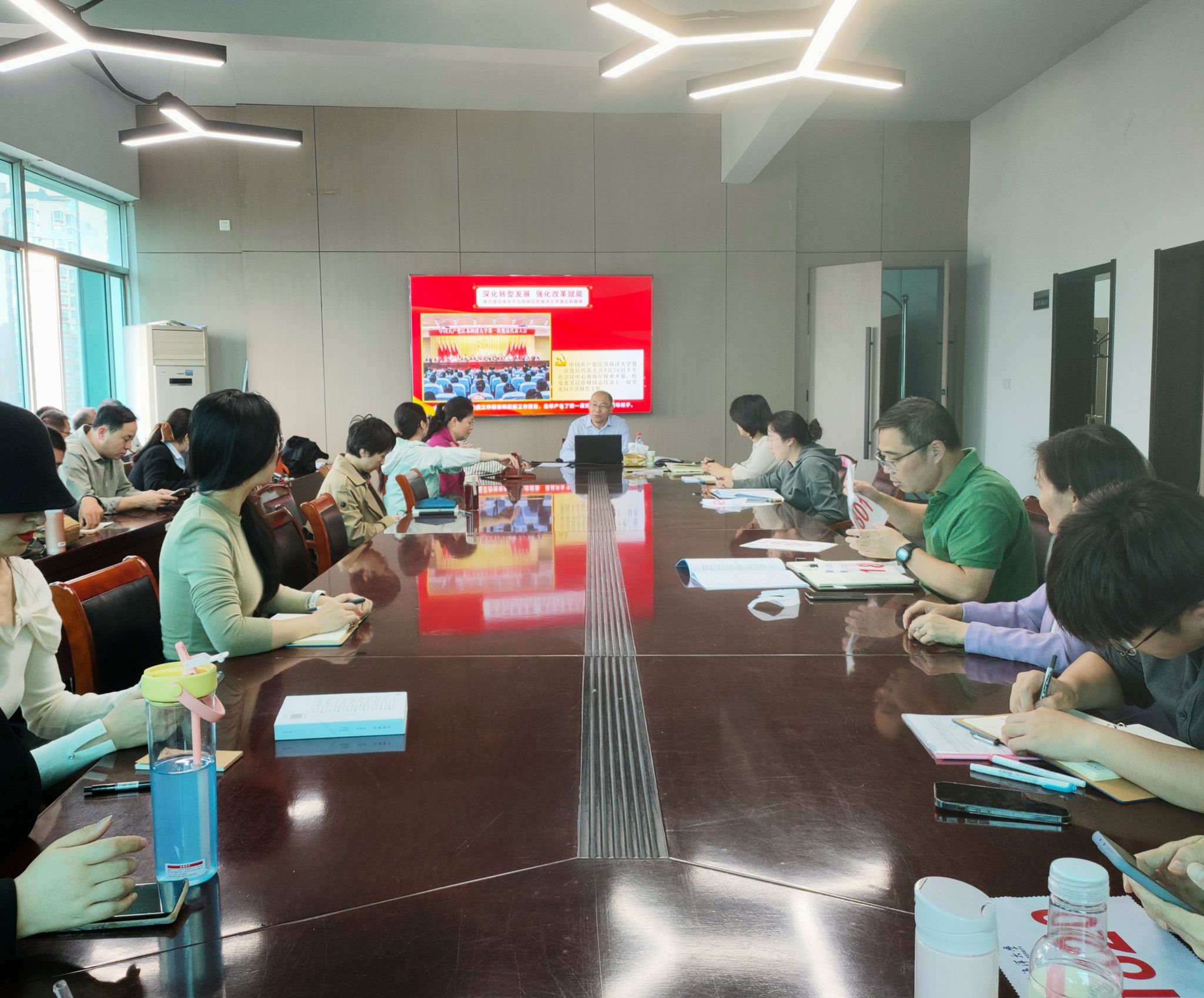 近日,艺术设计学院全体教职工进行“深入学习贯彻学校第一次党代会精神”专题学习,党总支书记李春带领大家学习了《中共江苏海洋大学委员会关于学习宣传贯彻中国共产党江苏海洋大学第一次党员代表大会精神的决定》和党代会工作报告《深化转型发展 强化改革赋能 奋力谱写高水平应用研究型海洋大学建设新篇章》,作了《实干担当作为 为实现“三建一高”目标贡献力量》专题讲座,重点学习了报告中关于五年工作回顾、“六个必须”、学校未来发展的“三步走”战略等,并详细讲解了“三建一高”总体目标。