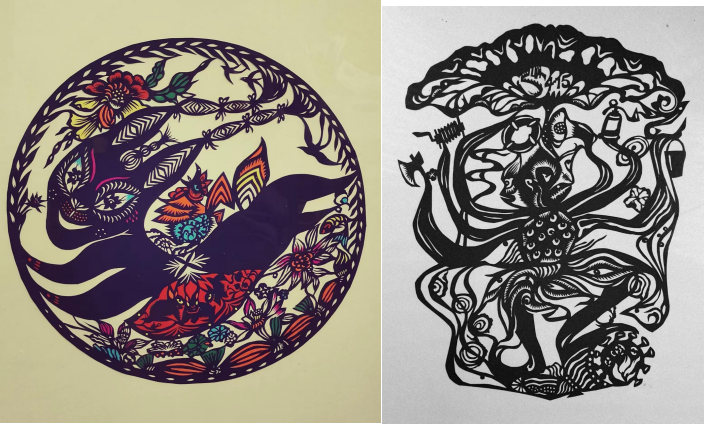 罗唯强剪纸艺术特点:在作品的剪法上突破了传统技法的对称、均衡和平面性,有意的引入了绘画技法的散点透视、轮廓线和明暗关系,同时又巧妙的保留了专用剪法的变形、夸张和装饰感,构思独特、装饰精巧、故事性强、文脉清晰,在不露痕迹中使一系列作品浑然天成,使观众看后回味无穷。