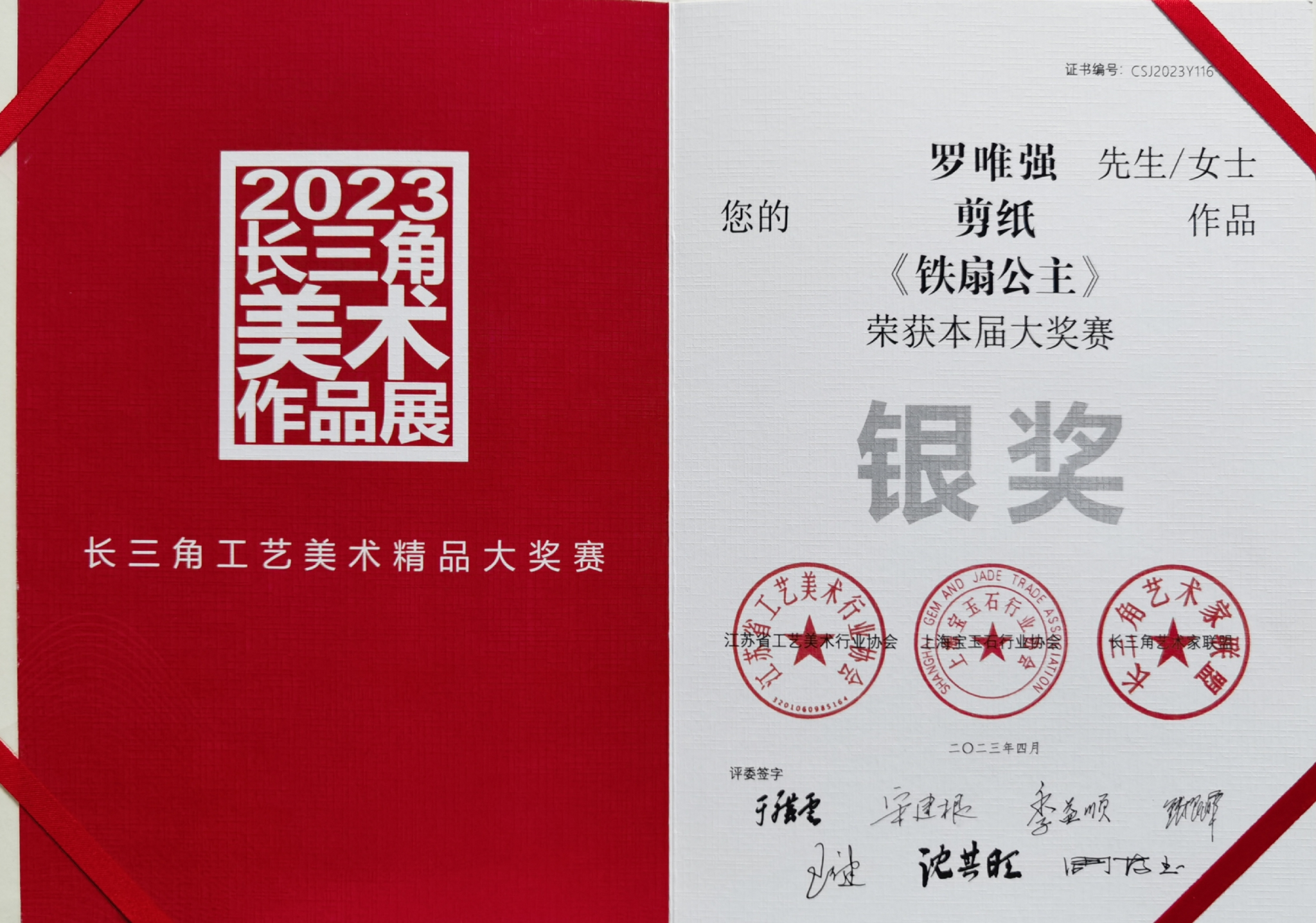 代表作:《顶冠冠》、《辫子虎》、《抗毒防疫必胜》、 《西游漫记》、《西游记主体人物》(系列)、《百年荣光》等,分别公开发表于各类报刊、杂志和申请相应知识产权。其中代表作《铁扇公主》荣获2023长三角工艺美术精品大奖赛“银奖”、《顶冠冠》曾获连云港工艺美术精品奖“银奖”、《地涌夫人》获“长三角美术作品展”“银奖”、《护着才会甜.守着才会久》在中国民协知识产权主题剪纸展斩获佳绩(江苏省共计入选20余幅)。