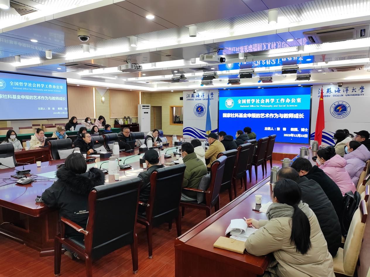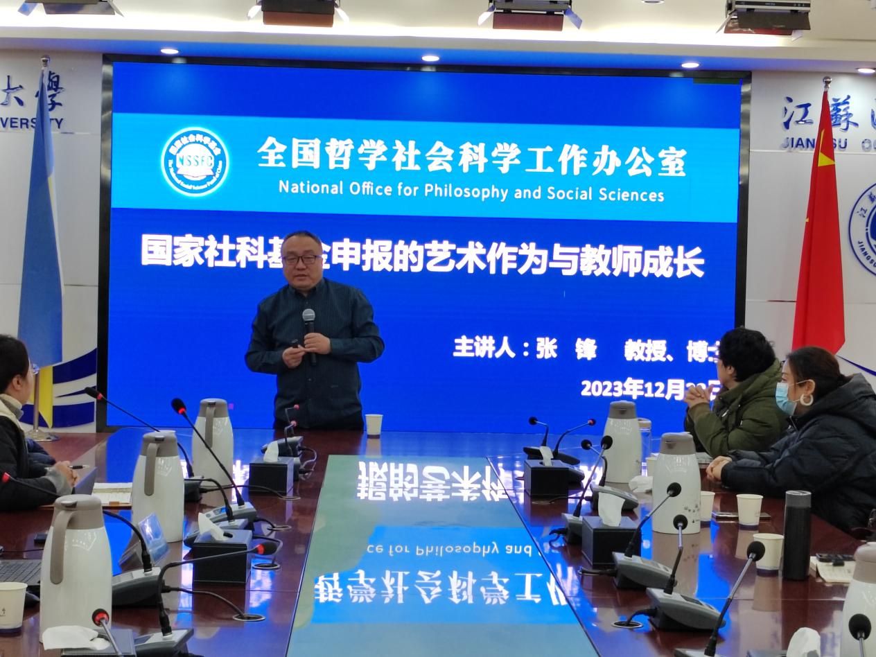 本次讲座以《国家社会科学基金申报的艺术作为与教师成长》为题,共分为三个部分。在第一部分,张锋教授就“科研与教学”的问题,梳理了“教”与“研”的逻辑关系,指出教学是教师的本分和使命,而科研则是教师自我提升和发展的重要途径,重点强调了“教学立命、科研立运”的重要性。第二部分是关于连云港地域特色项目选题的讲解。张锋教授以自己出版《贺州古厝》一书为例,启发在座的教师可以思考《连云港古厝》一书的撰写事宜。第三部分是本次讲座的重点,张锋教授以“2023年国家社科基金项目指南”为切口,通过实际案例示范怎样根据指南进行选题的拟定,并进一步分享了申报书撰写的经验、方法与技巧。讲座最后,张锋教授与参会人员就讲座内容、自身思考等进行了交流。