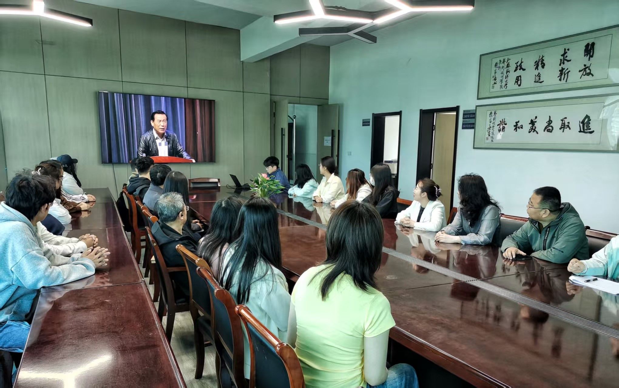本次活动旨在通过学术讲座的形式,深入探讨中国艺术在这两个领域中展现出的独特魅力和文化内涵,加深师生对舞台与银幕艺术的理解。直播过程中,主讲人从多个角度深入剖析了舞台与银幕艺术的特点、发展历程以及二者之间的相互影响,丰富的案例和生动的讲解,展示了中国艺术在舞台与银幕上的独特表现形式和深厚文化底蕴。师生们全神贯注,认真聆听每一个观点,不时记录下重要内容。