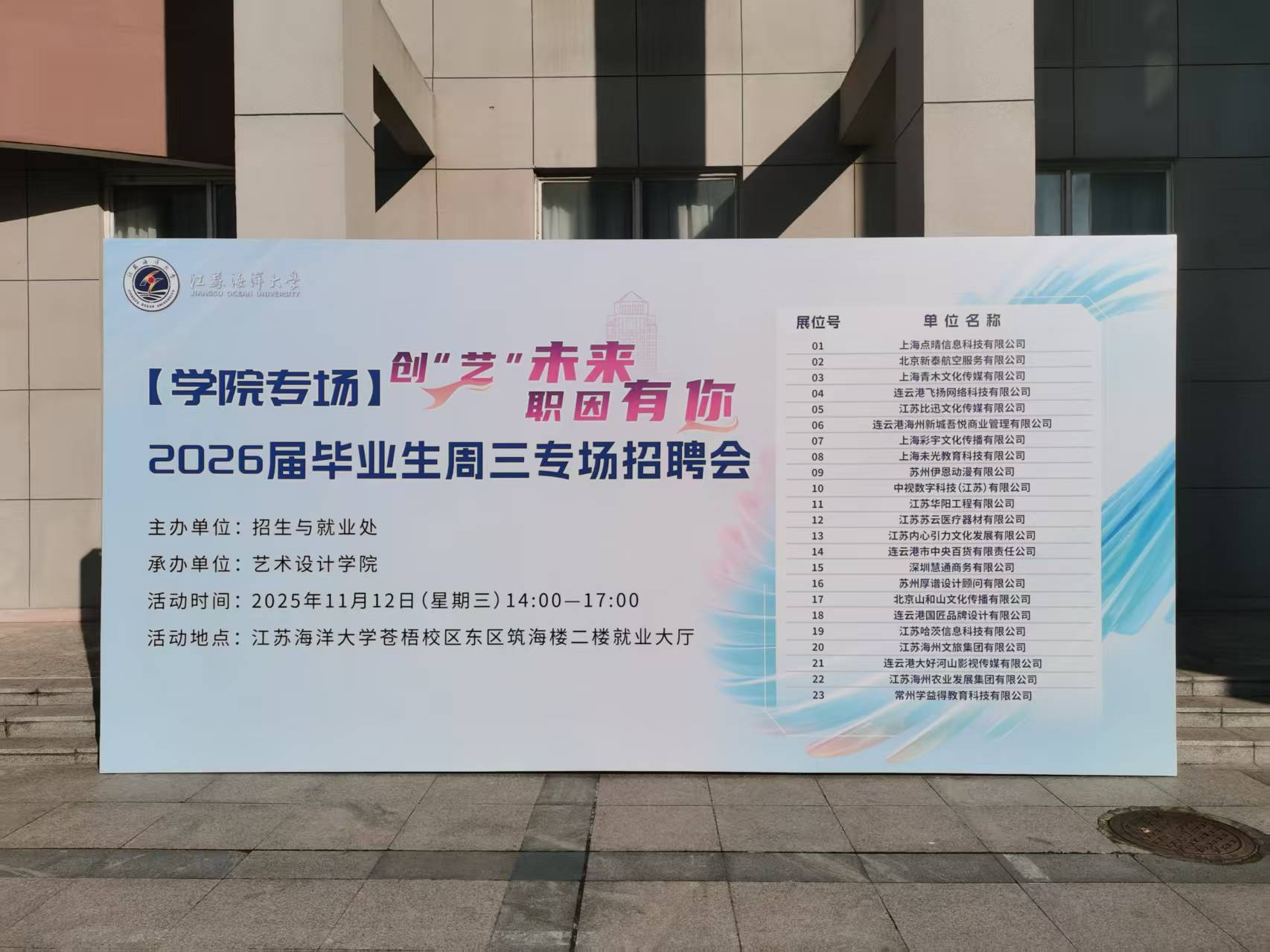 2025年11月12日下午,江苏海洋大学苍梧校区东区筑海楼二楼就业大厅内热潮涌动、气氛热烈。由我校招生与就业处主办、艺术设计学院承办的“创‘艺’未来,职因有你”2026届毕业生秋季专场招聘会在此盛大启幕。