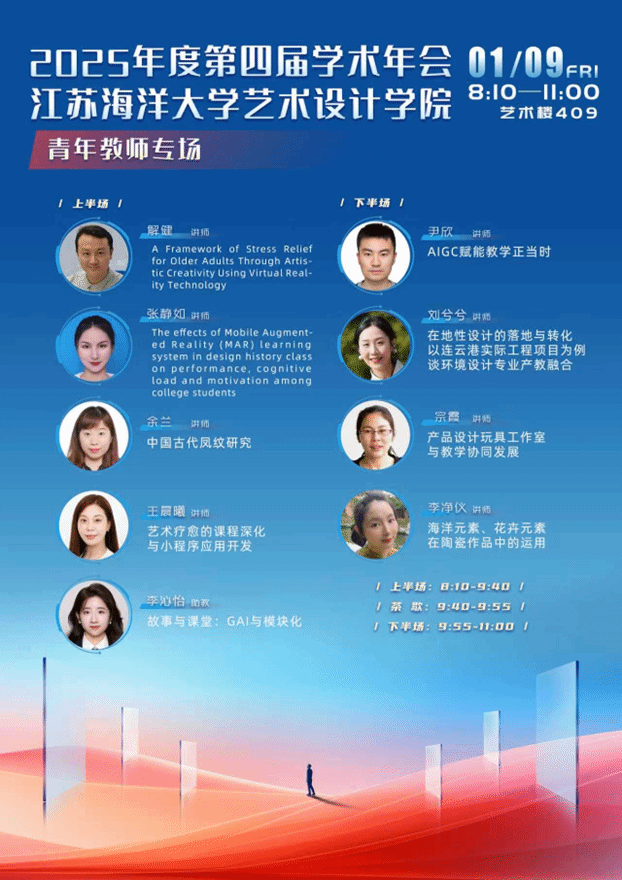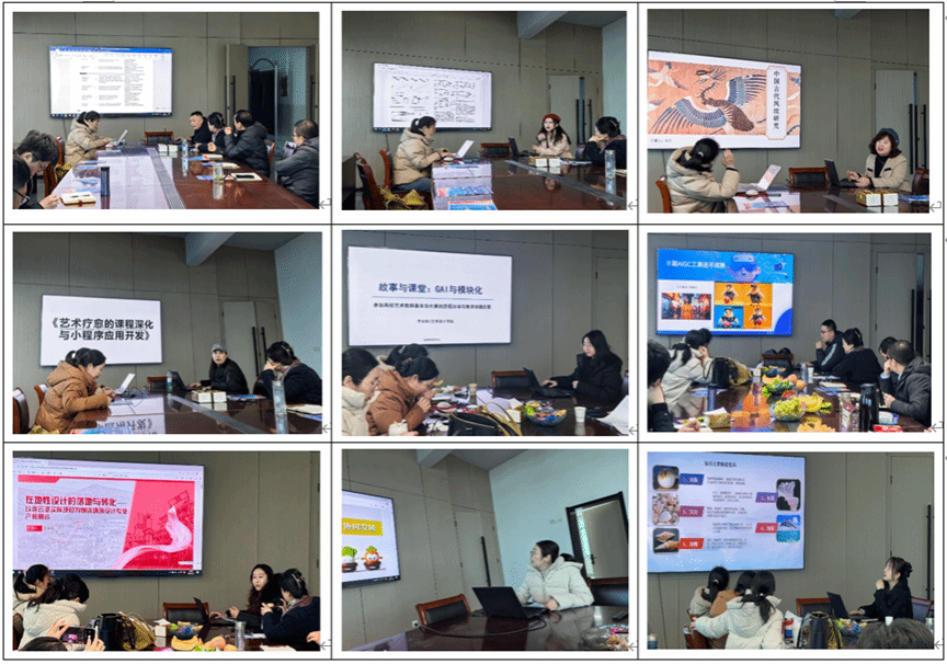 本次专场分为上半场与下半场,中间设置茶歇环节供教师交流探讨。上半场,解建老师以《A Framework of Stress Relief for Older Adults Through Artistic Creativity Using Virtual Reality Technology》为题,探讨虚拟现实技术在老年艺术疗愈中的应用框架;张静如老师分享《The effects of Mobile Augmented Reality (MAR) learning system in design history class on performance, cognitive load and motivation among college students》,剖析移动增强现实学习系统对设计史课堂的教学影响;余兰老师围绕“中国古代凤纹研究”展开深度剖析,挖掘传统纹样的艺术价值与文化内涵;王晨曦老师聚焦“艺术疗愈的课程深化与小程序应用开发”,探索艺术疗愈与数字技术结合的教学新路径;李沁怡老师则以《故事与课堂:GAI与模块化》为题,分享人工智能与模块化教学融合的实践探索。