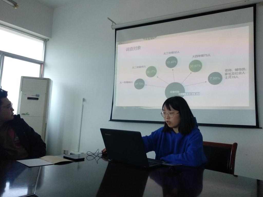 会上,各个小组以PPT汇报的方式对调研工作的开展情况、目前存在的问题、调研中征求到的意见和建议等方面进行了详细的汇报。报告结果显示,目前艺术学院仍有少部分学生对于安全问题的认识不到位;各个年级学生的思想状况问题不一,尤其一二年级学生存在迷茫,对未来担忧等情况;英语学习有待提高,希望得到帮扶的同学较多;各个年级都存在游戏时间较长的同学,较难进行时间管理;学生对专业分流的满意度有显著提高等。