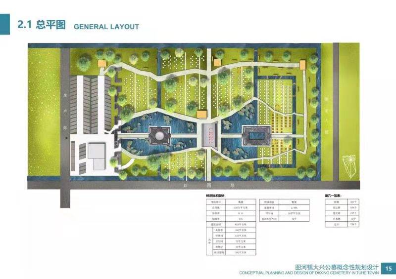 艺术学院以环境设计专业为依托,组建了设计团队,在前期沟通的基础上,6月初派两位专业教师专程前往图河镇进行实地考察,设计团队结合当地地形地貌,按照节约用地、保护生态环境、合理布局的要求,遵循生态性、人文性和地域性的设计原则对大兴公墓进行了全景规划。规划方案以直行路渠为基础划分墓葬区域,曲折小路蜿蜒连绵。入口为孝文化广场,墓葬区域集中于中间部分。墓区分为莲花苑、永慈苑、福寿苑三苑。四周由柳树围合形成廊道,并结合园林景观,形成生态园区。整个墓园绿树掩映,芳草如茵,鲜花明艳,在肃穆中透出园林的明媚,让缅怀之人在不知不觉中超脱自然,越于生死之外,融于自然的景观之中。