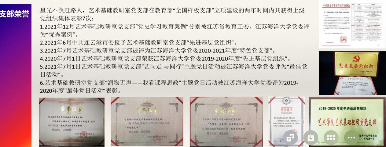 2019年12月,艺术设计学院艺术基础教研室党支部入选教育部“全国党建工作样板支部”培育创建单位。在为期2年的培育期内,该党支部在学校党委和艺术设计学院党总支的指导和支持下,深入学习习近平新时代中国特色社会主义思想,紧紧围绕培育创建任务目标,着力解决支部建设“思想”、“协同”、“融合”“实践”等“四大不足”瓶颈问题,推出“543党建工作法”创新党建工作模式,狠抓支部规范性、系统性、特色化、品牌化建设。