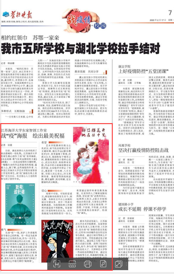据本次活动发起人,江苏海洋大学艺术学院教师、东家智创工作室负责人王栋介绍,1月29日,设计战“疫”海报的倡议发起后,已经有110余幅作品在经过指导与修改,通过订阅号等网上平台进行发布,学校也通过电子屏进行展示。通过线上与线下结合的方式进行宣教,获得了较好的效果。如今,参与战“疫”海报创作的队伍壮大了,天津师范大学等一些高校也将携起手来,通过设计海报等方式,用满满的祝福,投入这场鼓足勇气、充满希望、坚定信心的必胜战役中去。