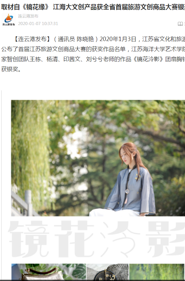 2020年1月3日,江苏省文化和旅游厅公布了首届江苏旅游文创商品大赛的获奖作品名单,江苏海洋大学艺术学院东家智创团队王栋、杨清、印茜文、刘兮兮老师的作品《镜花泠影》团扇胸针斩获银奖。