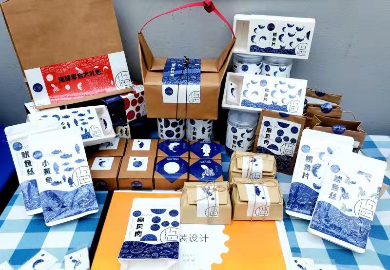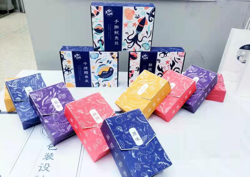 《包装设计》课程是18级视觉传达设计专业第6学期的最后一门专业课程,课程教学融入了品牌理念和综合训练元素。此次课程作品以海产品品牌包装为主题,进行海洋水产品包装外观和形态创意设计实践。为切实提高教学质量,更好地帮助学生完成实训,任课教师严格课堂管理和作业要求,将课堂延续到课下,利用休假时间指导学生。为达到满意的设计效果,不少同学整个暑假都在优化作品,甚至不惜花费千元优化材质。