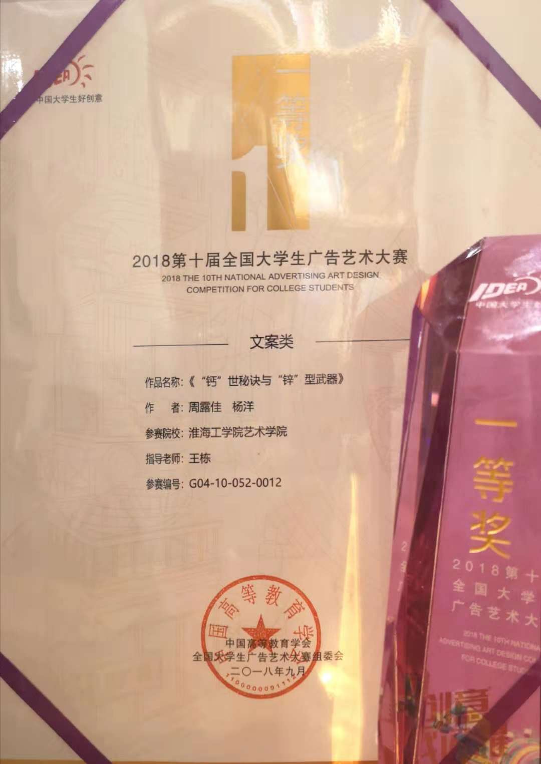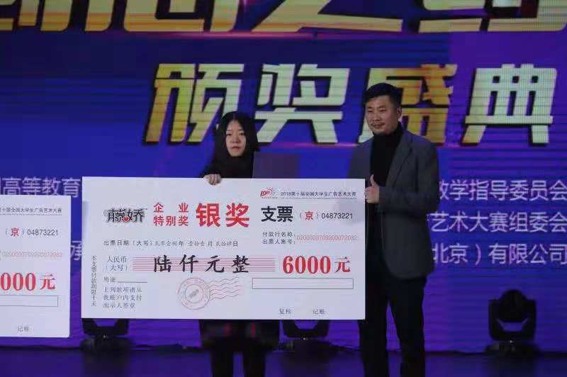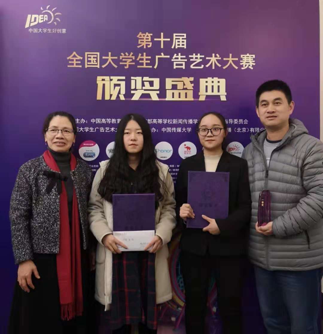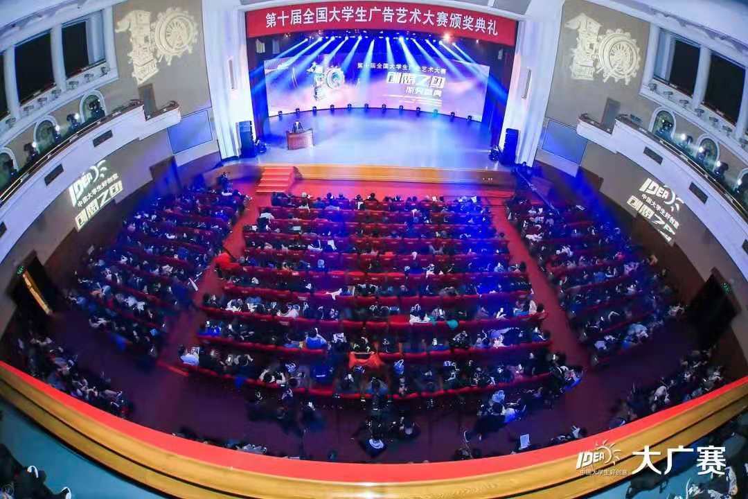11月24日,由教育部高等教育司指导,教育部高等学校新闻传播学类专业教学指导委员会、中国高等教育学会共同主办的第十届全国大学生广告艺术大赛颁奖典礼在北京政协礼堂隆重举行,获得文案类一等奖、企业特别奖银奖的的我院学生代表周露佳、冯震先后登台领奖。
