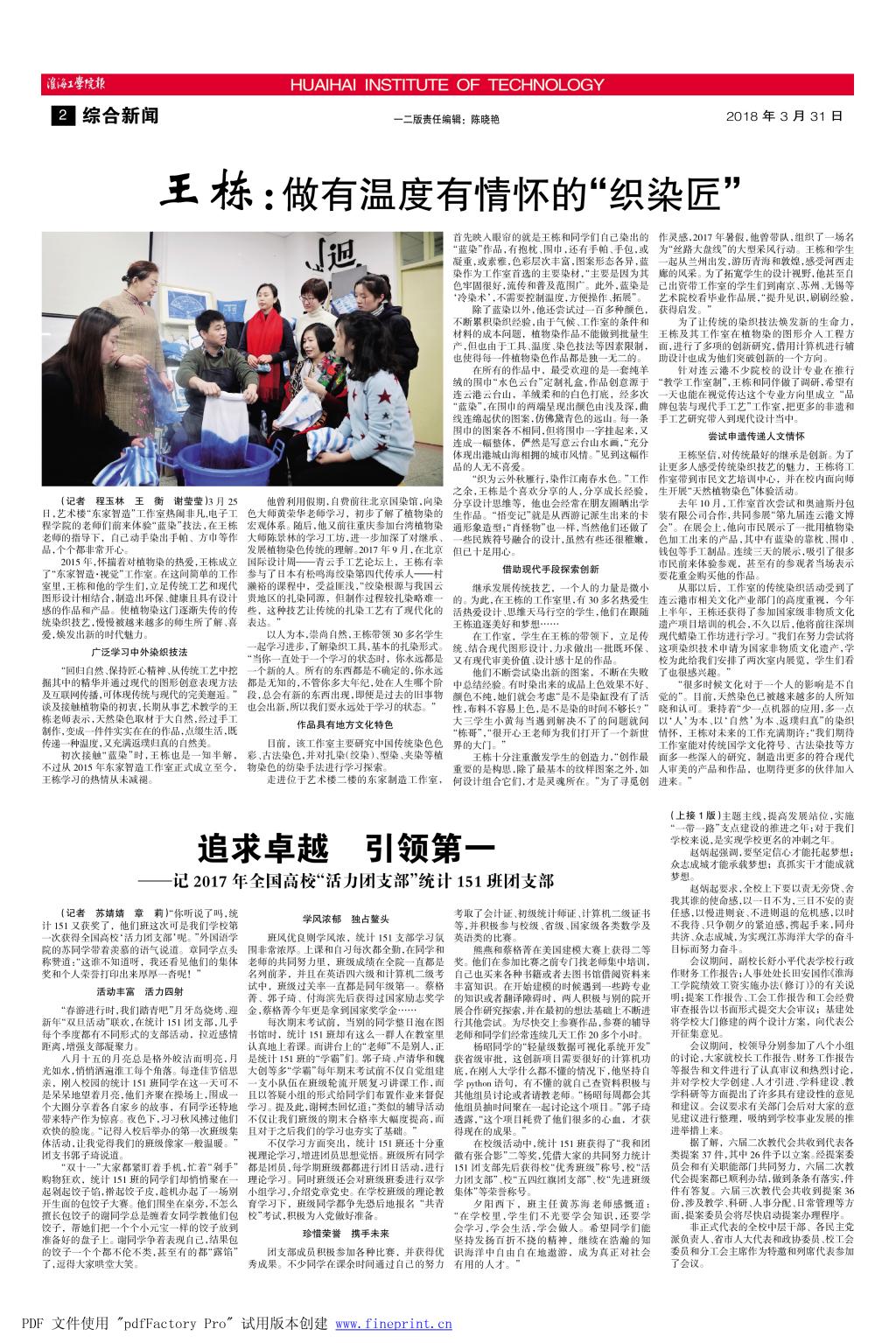 从那以后,工作室的传统染织活动受到了连云港市相关文化产业部门的高度重视,今年上半年,王栋还获得了参加国家级非物质文化遗产项目培训的机会,不久以后,他将前往深圳现代蜡染工作坊进行学习。“我们在努力尝试将这项染织技术申请为国家非物质文化遗产,学校为此给我们安排了两次室内展览,学生们看了也很感兴趣。”