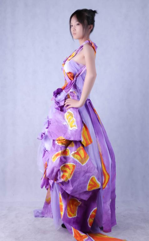 想到大多数设计者采用蓝色,所以我组临时改变思想,采用高端大气的紫色,样式为公主裙,肩带采用了扇子与蝴蝶结相结合的手法,优雅中又不失俏皮。裙子的上半身铺了一层纱,并且将布折叠成几何形状,下半身背面是采用了门帘的样式,将四条布平铺,并成扇形洒落下来,前面是缝成了五个大小不等的蝴蝶结,侧面是将裙摆折叠起来,然后用钢丝加以蓬化。