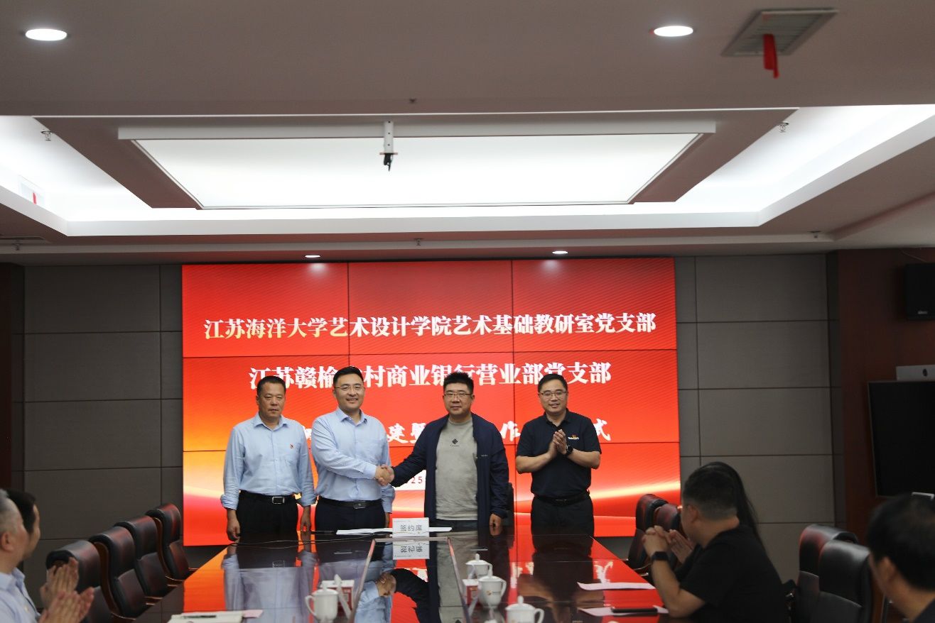 随后双方举行了党建共建交流会,赣榆农村商业银行党委委员、副行长邵军对江苏海洋大学艺术设计学院一行表示热烈欢迎,营业部党支部书记贾志伟介绍了该支部基本情况,王欢介绍了学院在党建引领、人才培养、校地共建、志愿服务等方面的具体情况,随后双方围绕党建与业务融合、人才培养与实践基地建设、科研成果转化等议题展开深入交流,旨在通过支部共建搭建资源共享、优势互补的合作平台,推动党建引领下的校企协同发展。在邵军、王欢见证下,艺术基础教研室党支部与赣榆农村商业银行营业部党支部签署了党建共建合作协议。