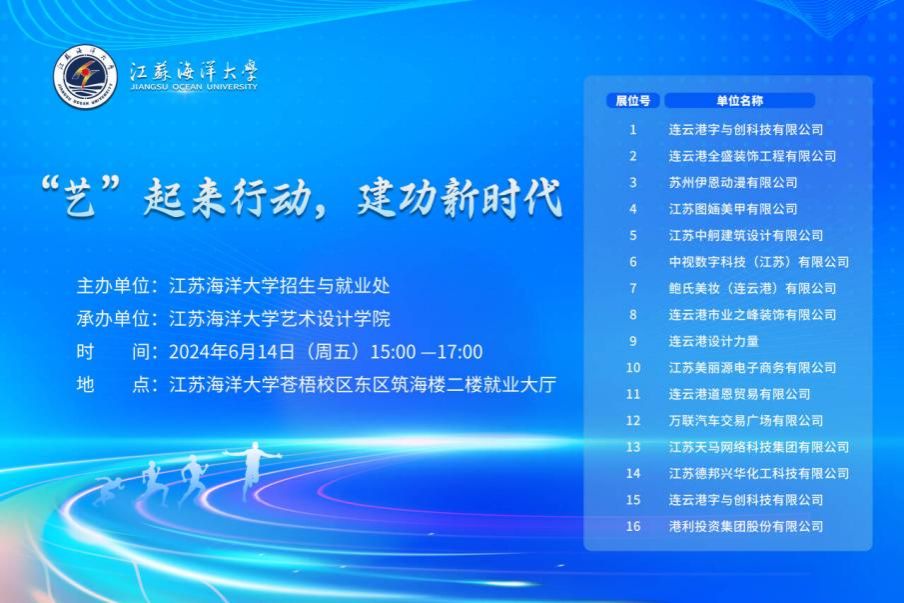 6月14日下午,“‘艺’起来行动,建功新时代”专场招聘会在江苏海洋大学筑海楼二楼就业大厅顺利举行。本次招聘会由江苏海洋大学招生与就业处主办,艺术设计学院承办,旨在为2024届尚未就业学生开展就业帮扶,打造“送岗直通车”,同时为2025届学生搭建一个展示自我、对接企业的平台,进一步促进校企合作。
