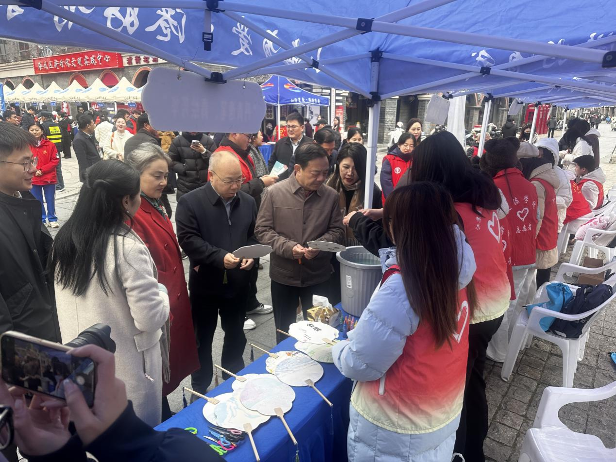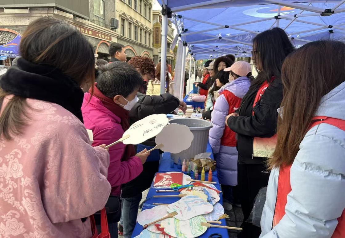 在志愿服务市集的蓝色帐篷下,“丹青逸笔,青绘芳华”的标牌格外醒目。艺术设计学院的师生志愿者提前备好了素白漆扇、彩纸、专用剪刀等工具,展板上陈列着山水纹样漆扇、吉祥窗花等非遗作品样本。活动开场不久,摊位前便围满了市民;老人凑近案几观摩技法,孩童拉着家长的手踮脚等待体验,年轻市民举着手机记录创作细节,现场暖意融融。