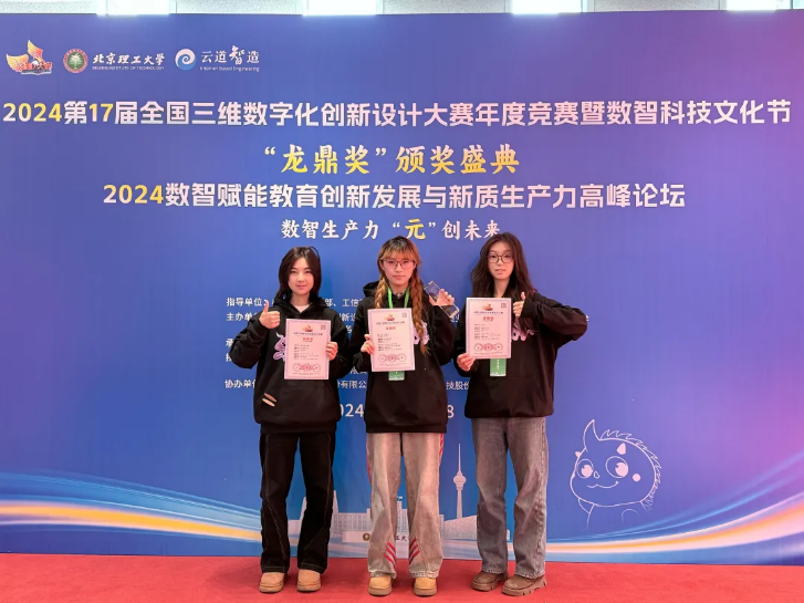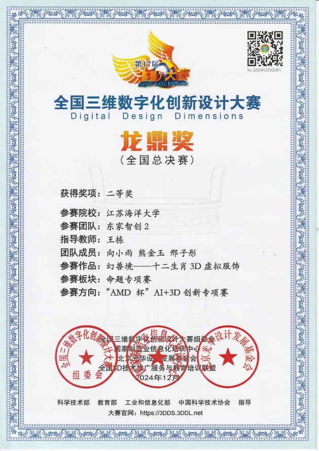 2024年12月6日-8日,第17届全国三维数字化创新设计大赛全国总决赛在北京理工大学举行,我院东家智创团队成员向小雨、熊金玉、邢子彤的作品《十二生肖3D虚拟服饰》获得“AMD杯“AI+3D创新专项赛“最佳创新单项奖”、“龙鼎奖二等奖”和“江苏赛区特等奖”!