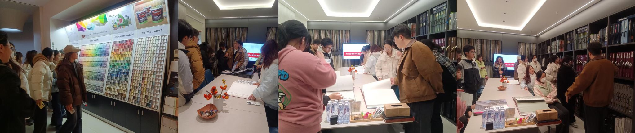 为进一步强化学生对材料的认知,11月27日,师生赴兴隆装饰材料城开展专项调研。在国际知名品牌连云港玛堡装饰材料有限公司,杨晓东总经理亲自带队讲解,从流行趋势、材料性能到空间氛围营造,引导学生通过触摸、观察、互动,理解材料与情感需求的深层联结。这种“工地+市场”的双场景实践模式,彻底改变了传统课堂“重理论、轻实操”的局限,让学生在真实行业环境中锤炼技能、积累经验。