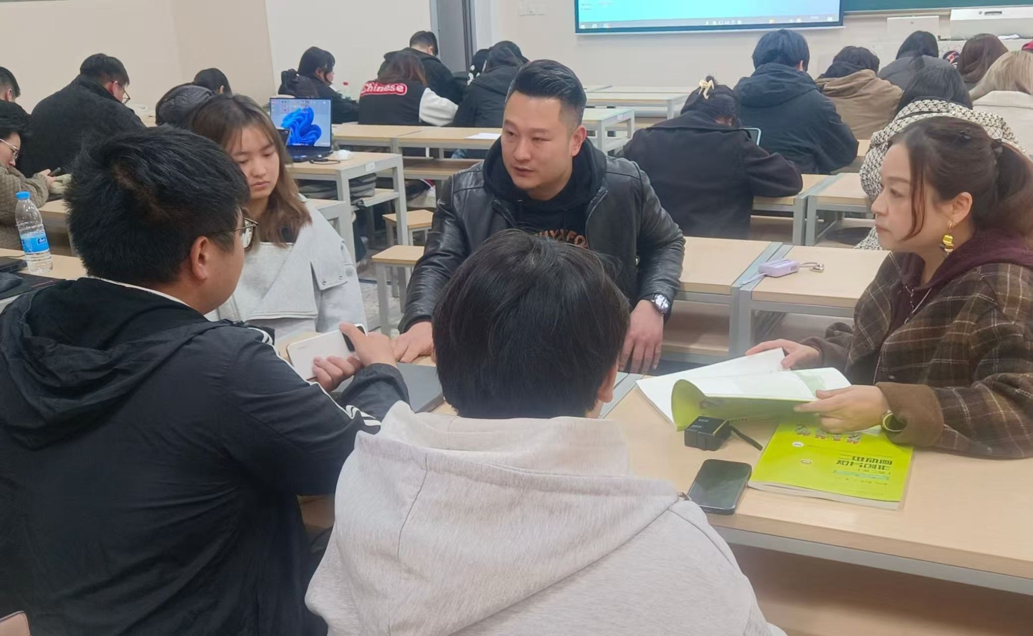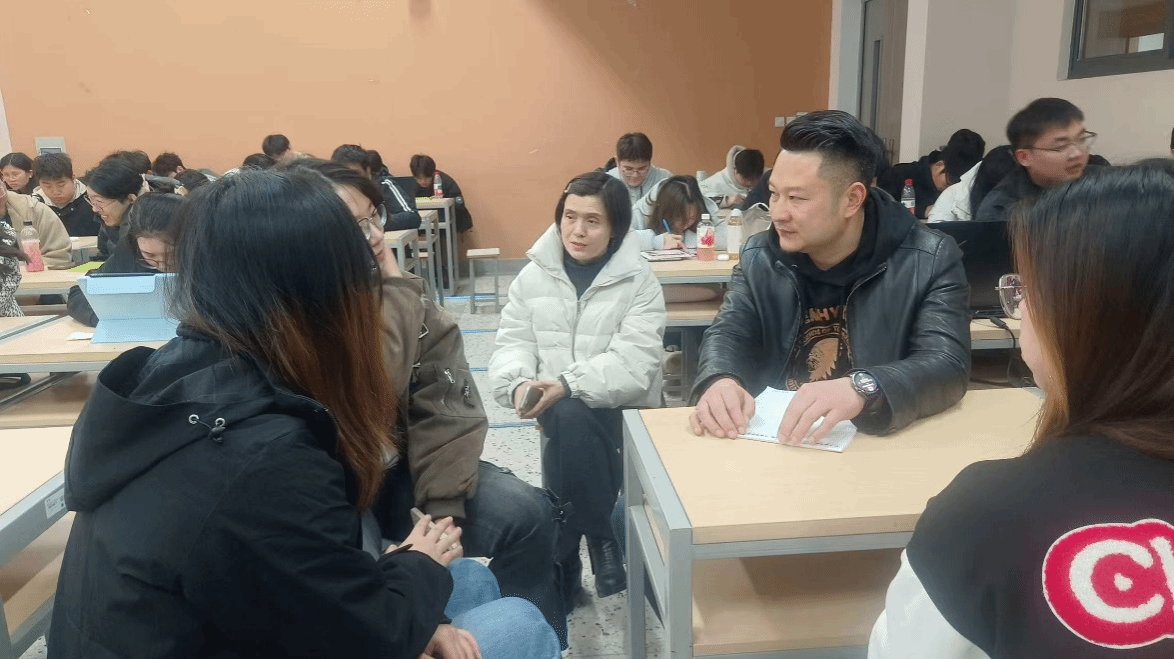 在AI动画创作小组研讨环节,同学们以小组为单位,结合本次学习内容积极交流创作思路、分享工具体验、碰撞创意观点,柏老师也走进同学之间,与大家开展面对面交流,一对一答疑,同学们提问踊跃,现场氛围热烈。